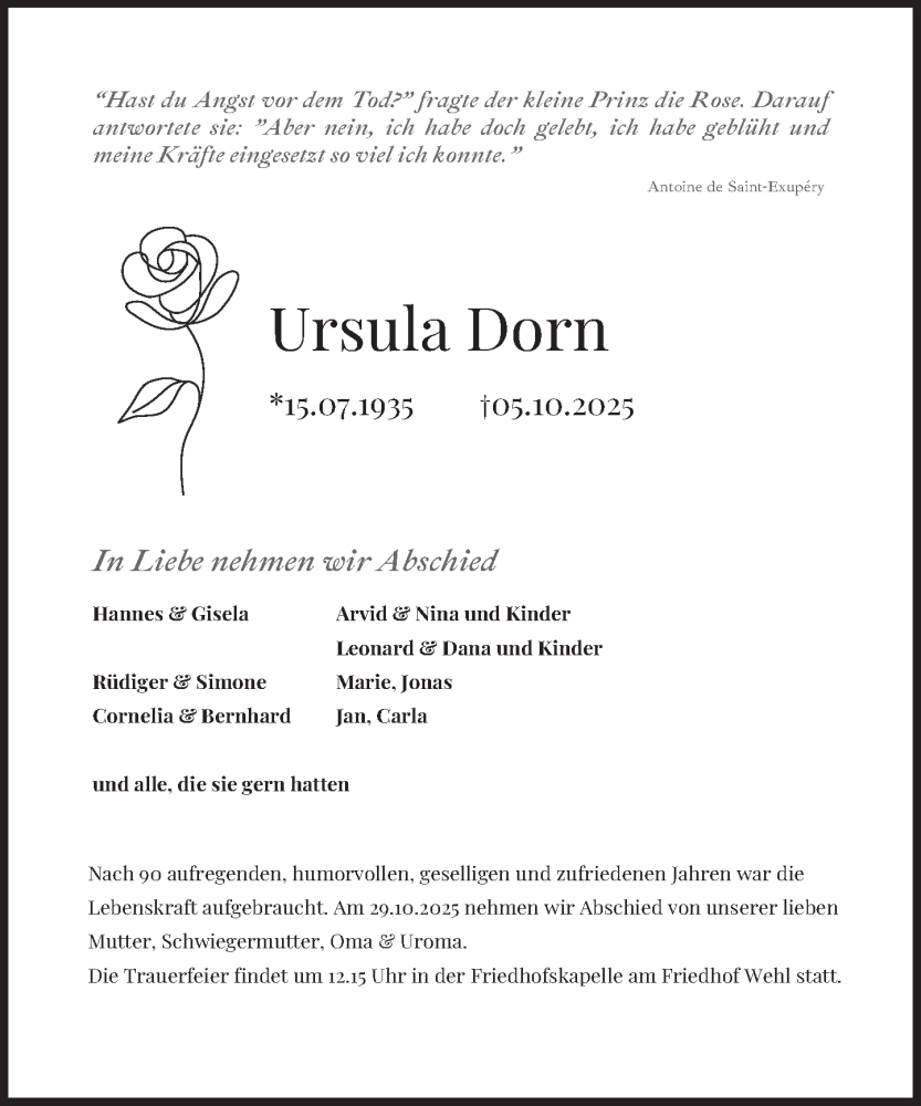 Hier finden Sie alle Traueranzeigen aus der Zeitung, die bisher für Ursula Dorn erschienen sind. Weitere Traueranzeigen, die in der Zeitung erscheinen, werden hier ebenfalls aufgelistet