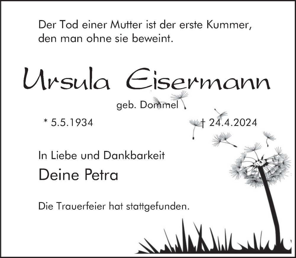 Hier finden Sie alle Traueranzeigen aus der Zeitung, die bisher für Ursula Eisermann erschienen sind. Weitere Traueranzeigen, die in der Zeitung erscheinen, werden hier ebenfalls aufgelistet
