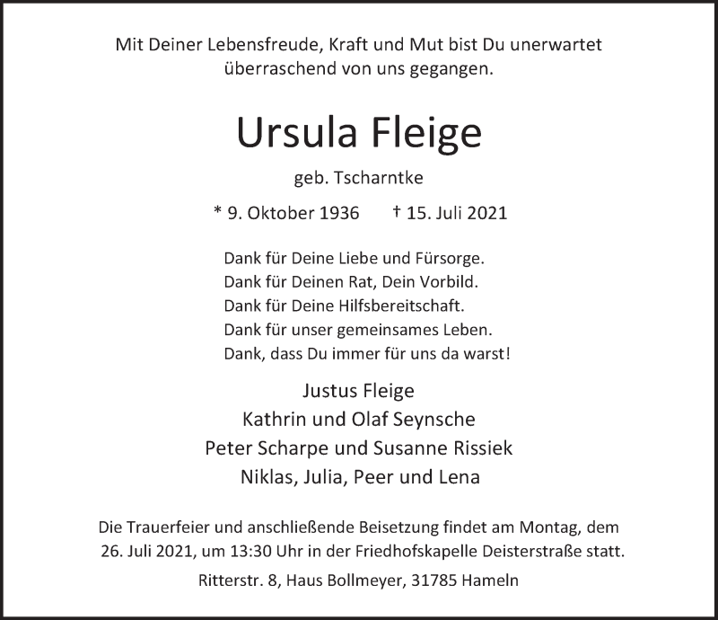 Hier finden Sie alle Traueranzeigen aus der Zeitung, die bisher für Ursula Fleige erschienen sind. Weitere Traueranzeigen, die in der Zeitung erscheinen, werden hier ebenfalls aufgelistet