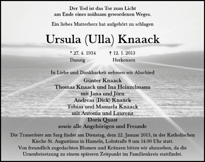Hier finden Sie alle Traueranzeigen aus der Zeitung, die bisher für Ursula Knaack erschienen sind. Weitere Traueranzeigen, die in der Zeitung erscheinen, werden hier ebenfalls aufgelistet