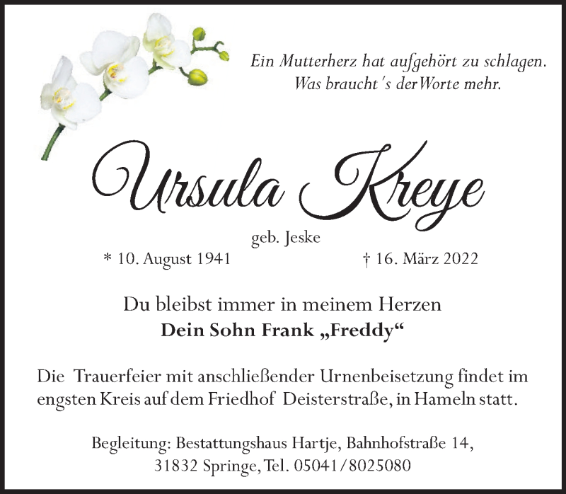Hier finden Sie alle Traueranzeigen aus der Zeitung, die bisher für Ursula Kreye erschienen sind. Weitere Traueranzeigen, die in der Zeitung erscheinen, werden hier ebenfalls aufgelistet