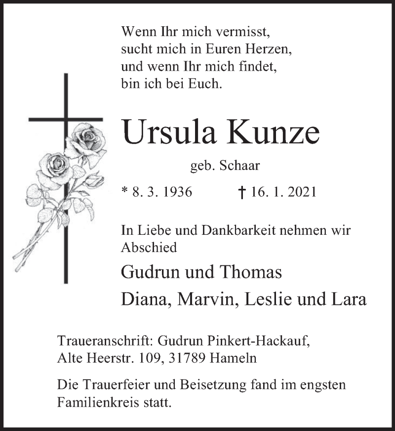 Hier finden Sie alle Traueranzeigen aus der Zeitung, die bisher für Ursula Kunze erschienen sind. Weitere Traueranzeigen, die in der Zeitung erscheinen, werden hier ebenfalls aufgelistet