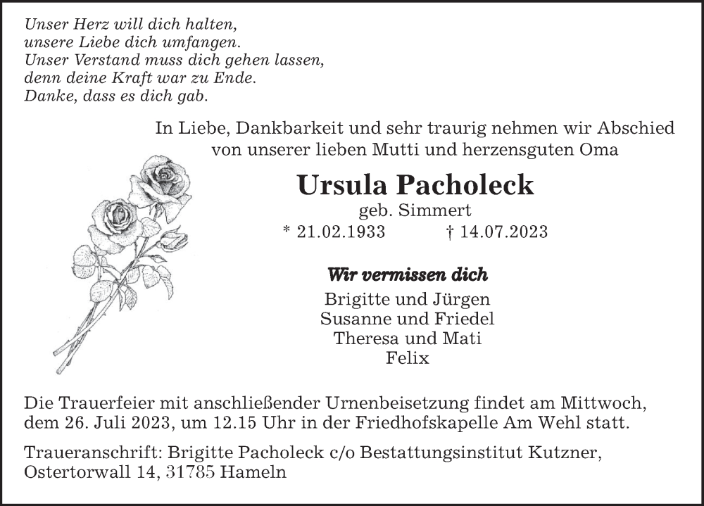 Hier finden Sie alle Traueranzeigen aus der Zeitung, die bisher für Ursula Pacholeck erschienen sind. Weitere Traueranzeigen, die in der Zeitung erscheinen, werden hier ebenfalls aufgelistet