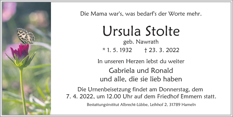 Hier finden Sie alle Traueranzeigen aus der Zeitung, die bisher für Ursula Stolte erschienen sind. Weitere Traueranzeigen, die in der Zeitung erscheinen, werden hier ebenfalls aufgelistet