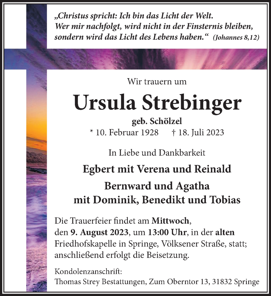 Hier finden Sie alle Traueranzeigen aus der Zeitung, die bisher für Ursula Strebinger erschienen sind. Weitere Traueranzeigen, die in der Zeitung erscheinen, werden hier ebenfalls aufgelistet