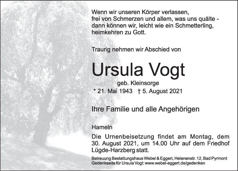 Hier finden Sie alle Traueranzeigen aus der Zeitung, die bisher für Ursula Vogt erschienen sind. Weitere Traueranzeigen, die in der Zeitung erscheinen, werden hier ebenfalls aufgelistet