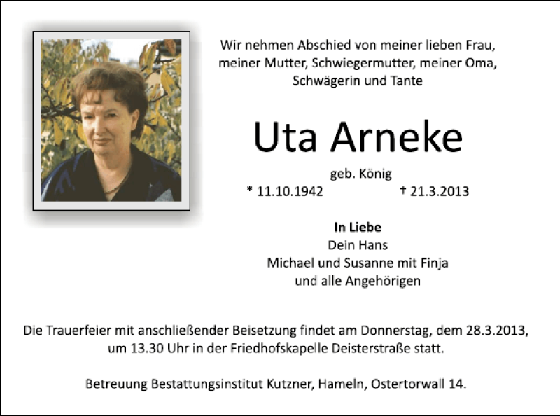 Hier finden Sie alle Traueranzeigen aus der Zeitung, die bisher für Uta Arneke erschienen sind. Weitere Traueranzeigen, die in der Zeitung erscheinen, werden hier ebenfalls aufgelistet