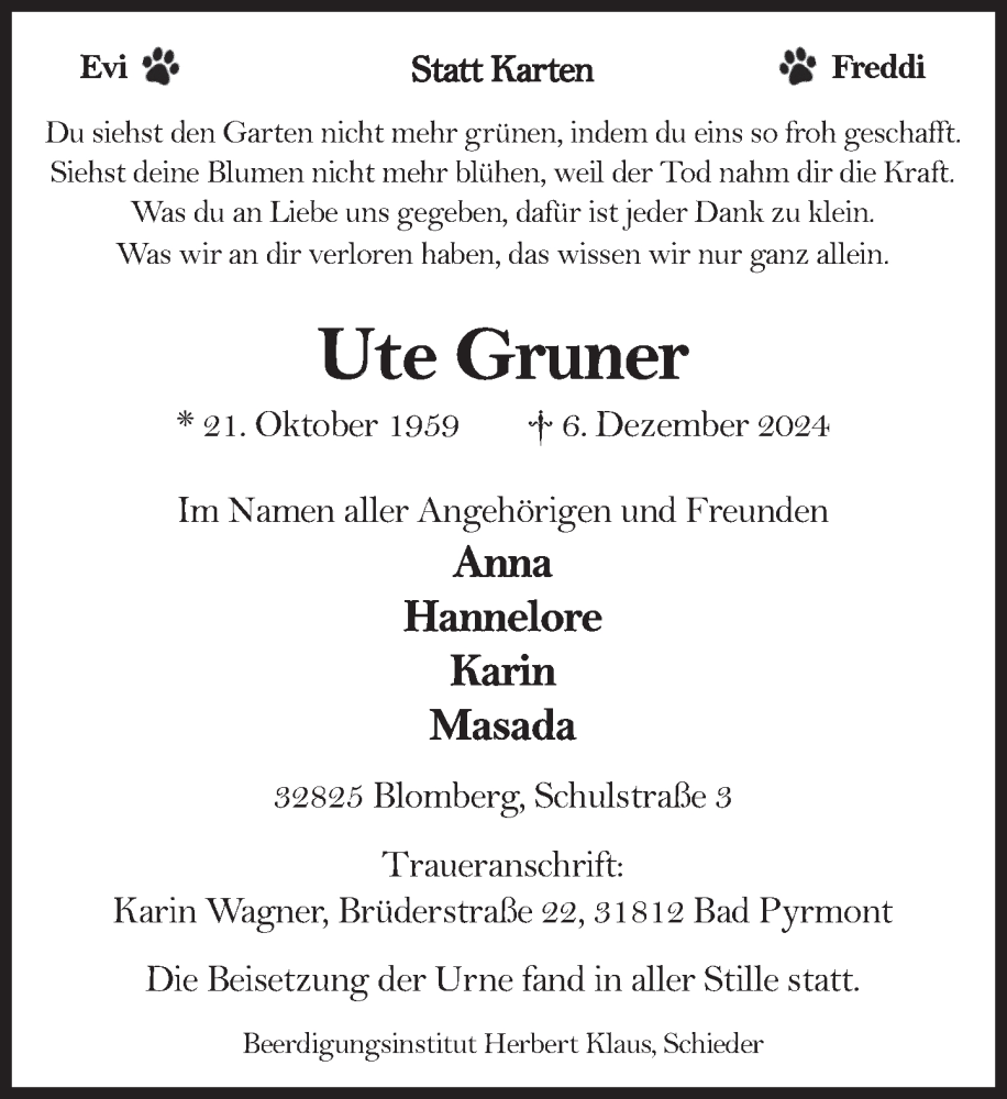 Hier finden Sie alle Traueranzeigen aus der Zeitung, die bisher für Ute Gruner erschienen sind. Weitere Traueranzeigen, die in der Zeitung erscheinen, werden hier ebenfalls aufgelistet