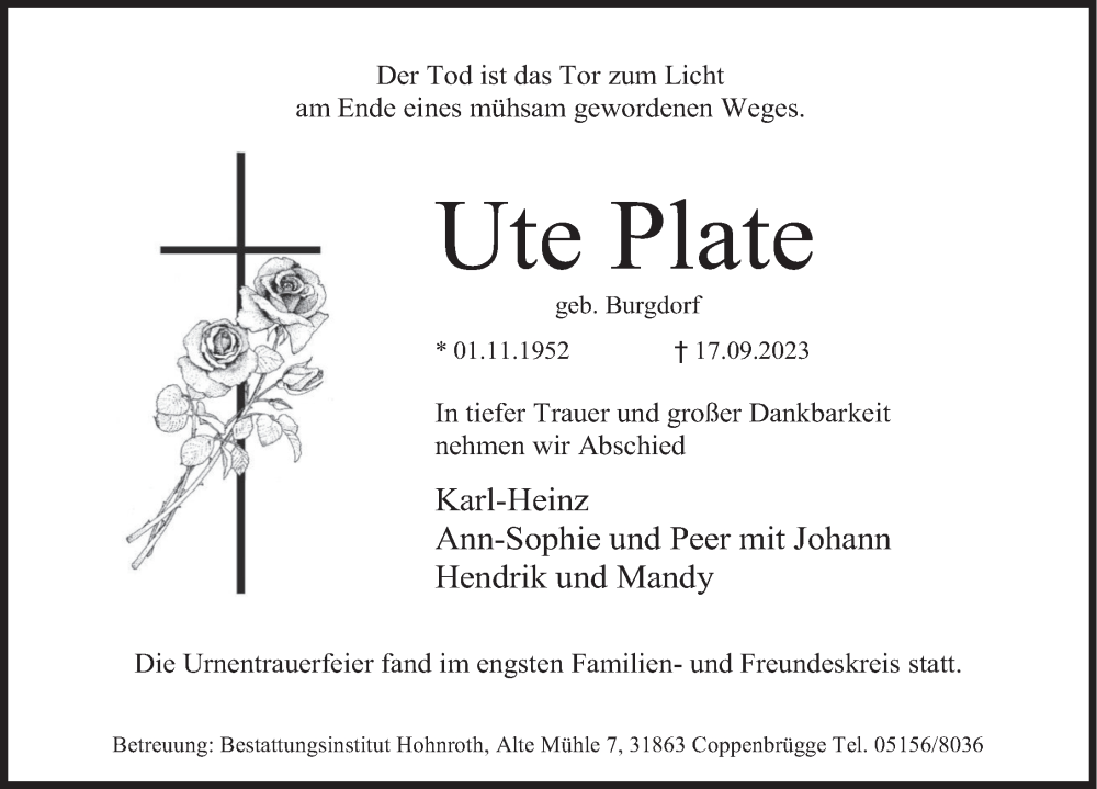 Hier finden Sie alle Traueranzeigen aus der Zeitung, die bisher für Ute Plate erschienen sind. Weitere Traueranzeigen, die in der Zeitung erscheinen, werden hier ebenfalls aufgelistet