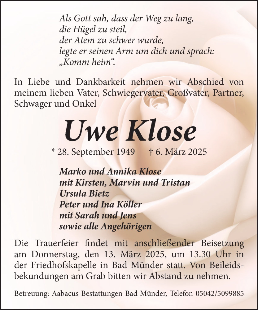 Hier finden Sie alle Traueranzeigen aus der Zeitung, die bisher für Uwe Klose erschienen sind. Weitere Traueranzeigen, die in der Zeitung erscheinen, werden hier ebenfalls aufgelistet
