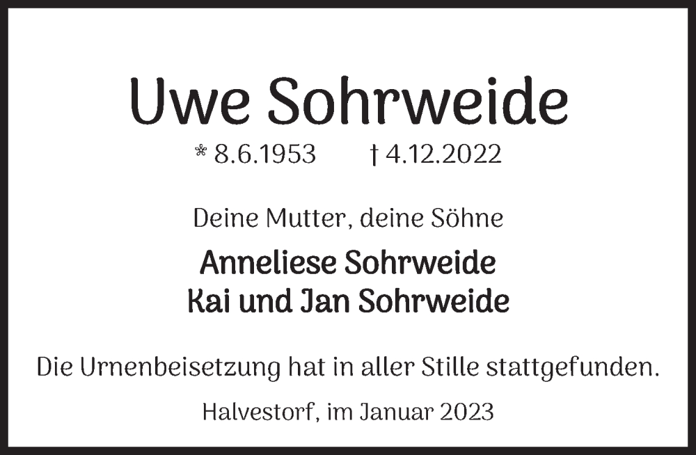 Hier finden Sie alle Traueranzeigen aus der Zeitung, die bisher für Uwe Sohrweide erschienen sind. Weitere Traueranzeigen, die in der Zeitung erscheinen, werden hier ebenfalls aufgelistet