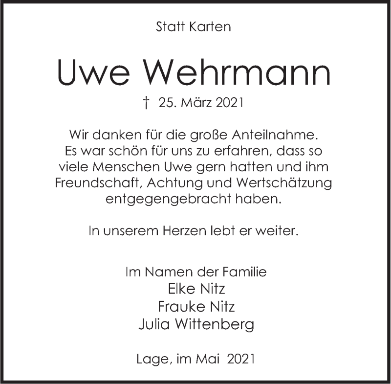 Hier finden Sie alle Traueranzeigen aus der Zeitung, die bisher für Uwe Wehrmann erschienen sind. Weitere Traueranzeigen, die in der Zeitung erscheinen, werden hier ebenfalls aufgelistet