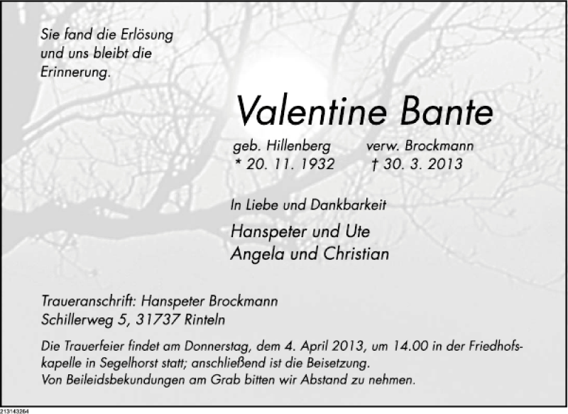 Hier finden Sie alle Traueranzeigen aus der Zeitung, die bisher für Valentine Bante erschienen sind. Weitere Traueranzeigen, die in der Zeitung erscheinen, werden hier ebenfalls aufgelistet