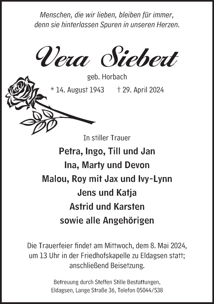 Hier finden Sie alle Traueranzeigen aus der Zeitung, die bisher für Vera Siebert erschienen sind. Weitere Traueranzeigen, die in der Zeitung erscheinen, werden hier ebenfalls aufgelistet