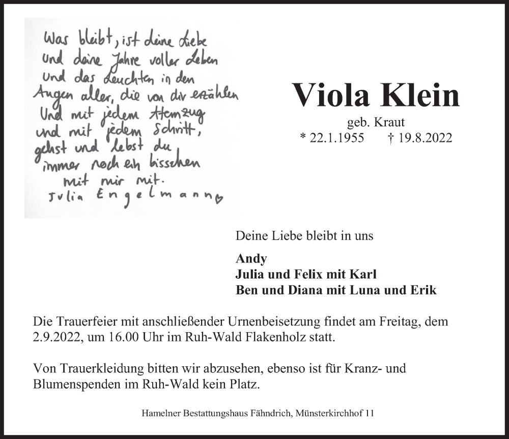 Hier finden Sie alle Traueranzeigen aus der Zeitung, die bisher für Viola Klein erschienen sind. Weitere Traueranzeigen, die in der Zeitung erscheinen, werden hier ebenfalls aufgelistet