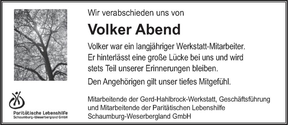 Hier finden Sie alle Traueranzeigen aus der Zeitung, die bisher für Volker Abend erschienen sind. Weitere Traueranzeigen, die in der Zeitung erscheinen, werden hier ebenfalls aufgelistet