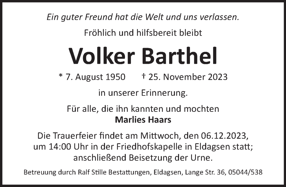 Hier finden Sie alle Traueranzeigen aus der Zeitung, die bisher für Volker Barthel erschienen sind. Weitere Traueranzeigen, die in der Zeitung erscheinen, werden hier ebenfalls aufgelistet