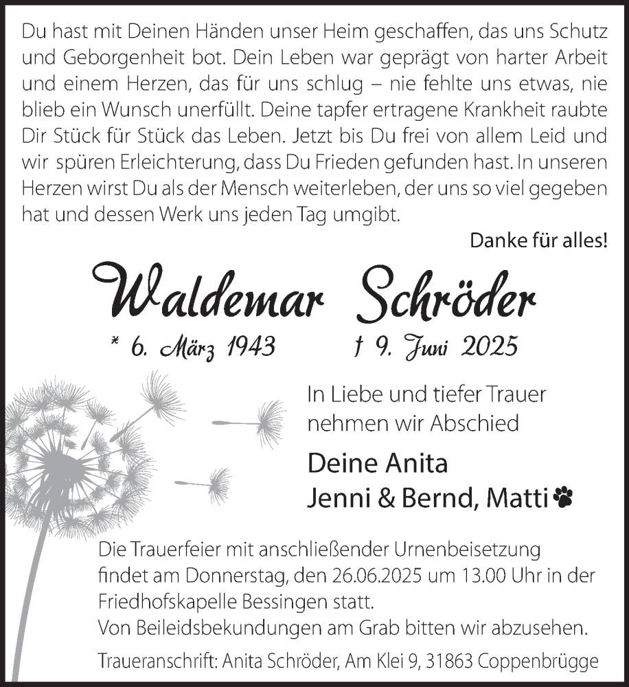 Hier finden Sie alle Traueranzeigen aus der Zeitung, die bisher für Waldemar Schröder erschienen sind. Weitere Traueranzeigen, die in der Zeitung erscheinen, werden hier ebenfalls aufgelistet