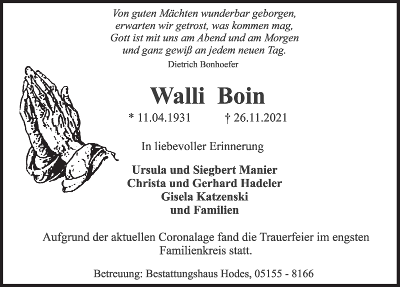 Hier finden Sie alle Traueranzeigen aus der Zeitung, die bisher für Walli Boin erschienen sind. Weitere Traueranzeigen, die in der Zeitung erscheinen, werden hier ebenfalls aufgelistet