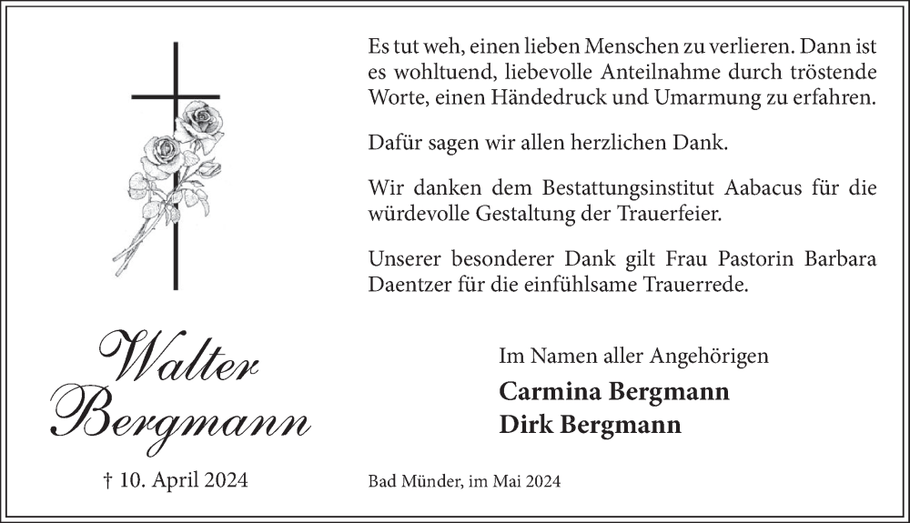 Hier finden Sie alle Traueranzeigen aus der Zeitung, die bisher für Walter Bergmann erschienen sind. Weitere Traueranzeigen, die in der Zeitung erscheinen, werden hier ebenfalls aufgelistet