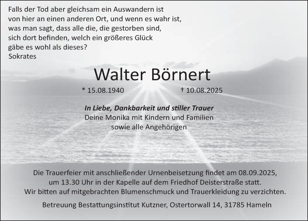 Hier finden Sie alle Traueranzeigen aus der Zeitung, die bisher für Walter Börnert erschienen sind. Weitere Traueranzeigen, die in der Zeitung erscheinen, werden hier ebenfalls aufgelistet