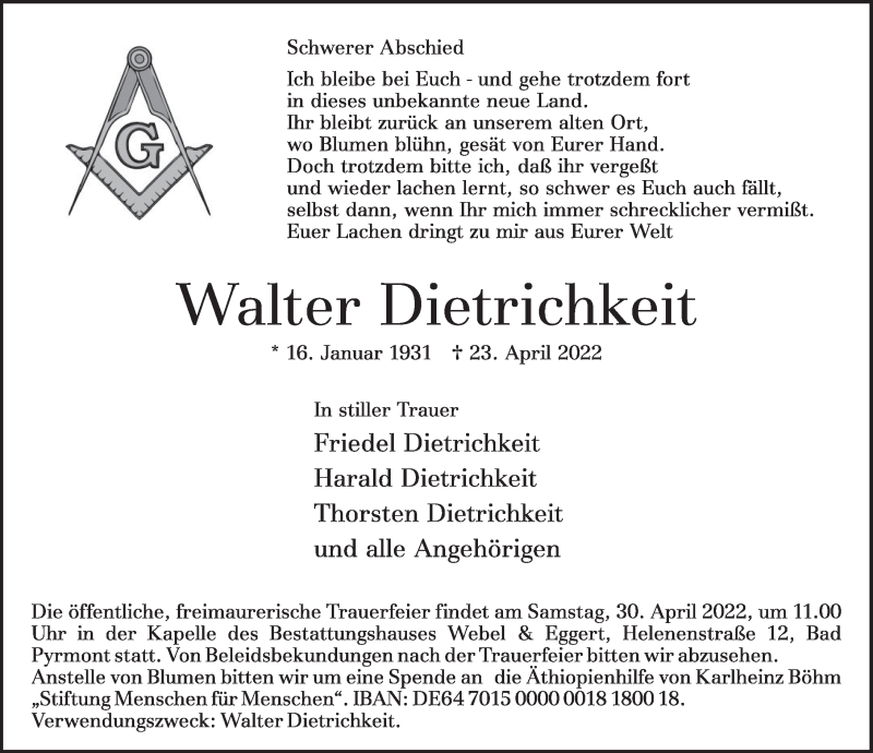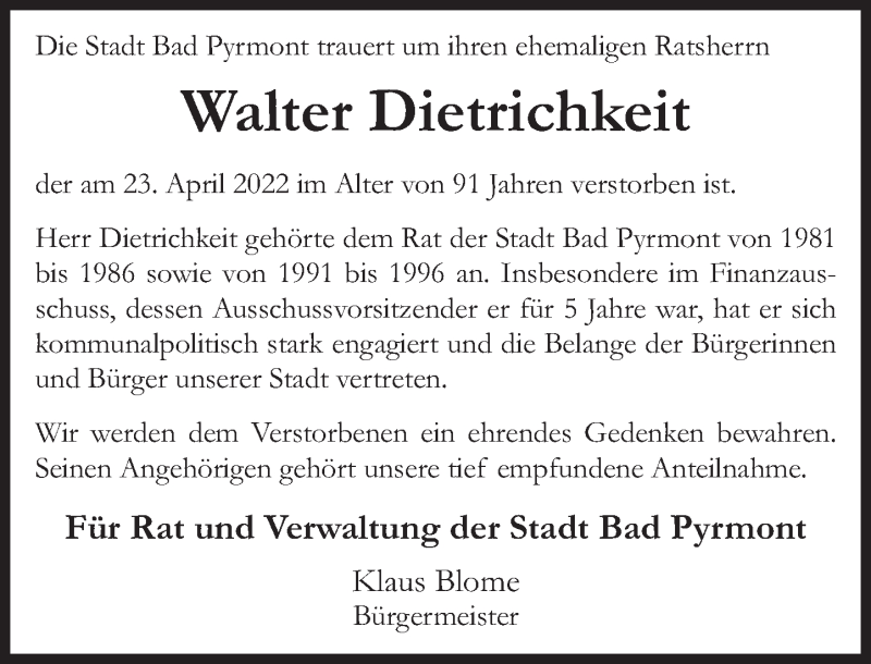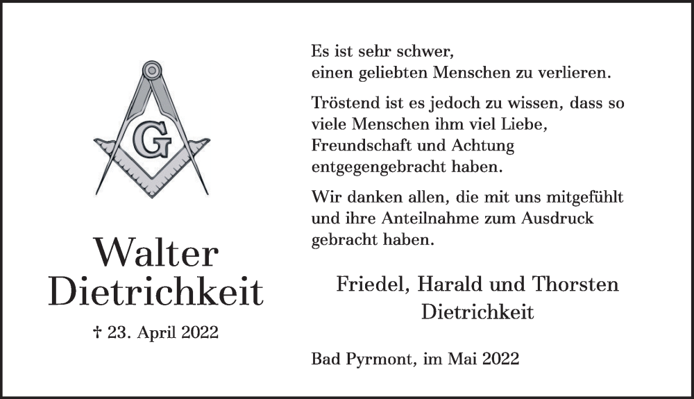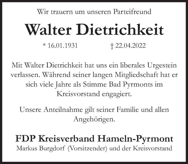 Hier finden Sie alle Traueranzeigen aus der Zeitung, die bisher für Walter Dietrichkeit erschienen sind. Weitere Traueranzeigen, die in der Zeitung erscheinen, werden hier ebenfalls aufgelistet