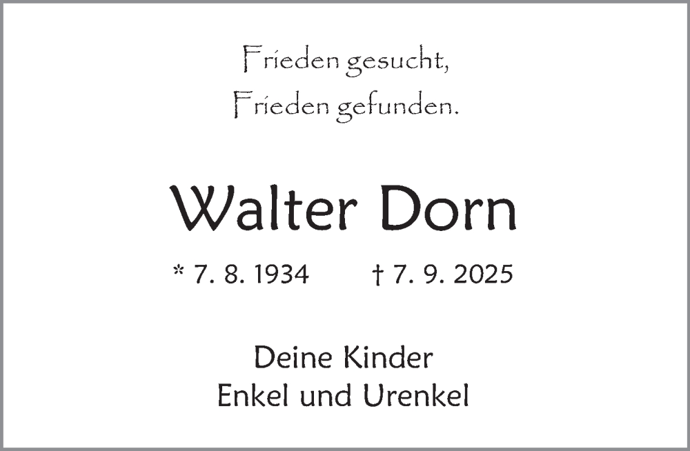 Hier finden Sie alle Traueranzeigen aus der Zeitung, die bisher für Walter Dorn erschienen sind. Weitere Traueranzeigen, die in der Zeitung erscheinen, werden hier ebenfalls aufgelistet