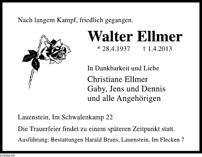 Hier finden Sie alle Traueranzeigen aus der Zeitung, die bisher für Walter Ellmer erschienen sind. Weitere Traueranzeigen, die in der Zeitung erscheinen, werden hier ebenfalls aufgelistet