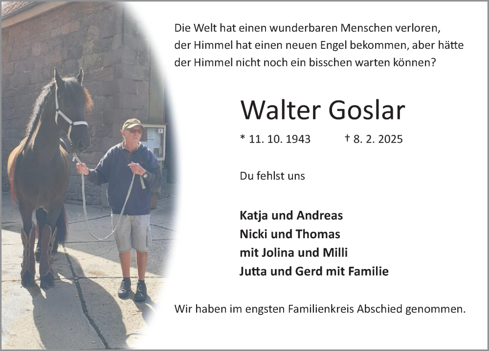 Hier finden Sie alle Traueranzeigen aus der Zeitung, die bisher für Walter Goslar erschienen sind. Weitere Traueranzeigen, die in der Zeitung erscheinen, werden hier ebenfalls aufgelistet