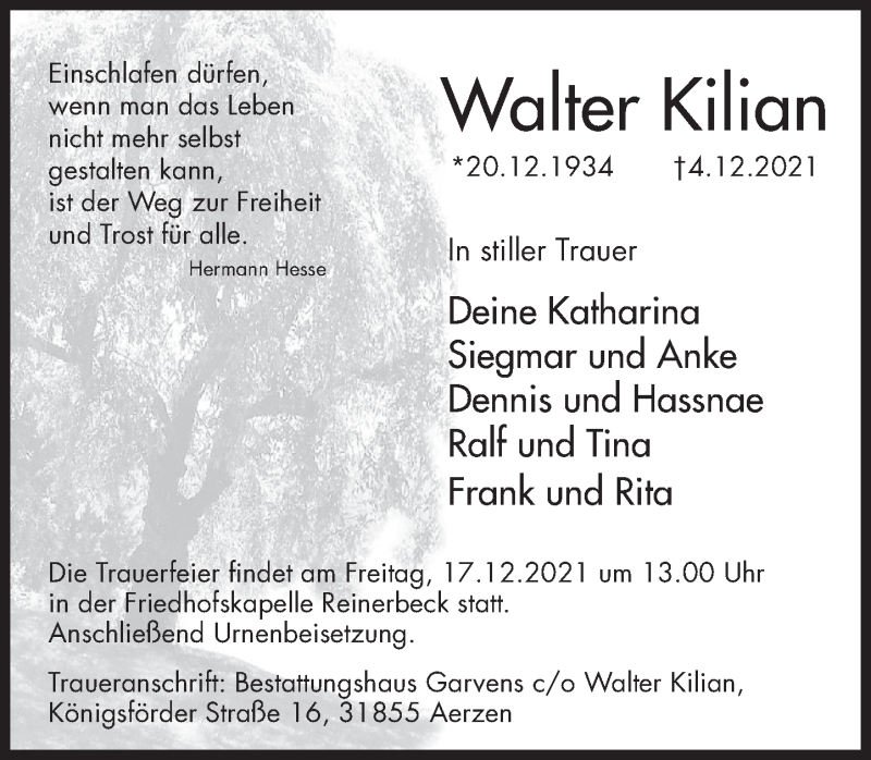 Hier finden Sie alle Traueranzeigen aus der Zeitung, die bisher für Walter Kilian erschienen sind. Weitere Traueranzeigen, die in der Zeitung erscheinen, werden hier ebenfalls aufgelistet