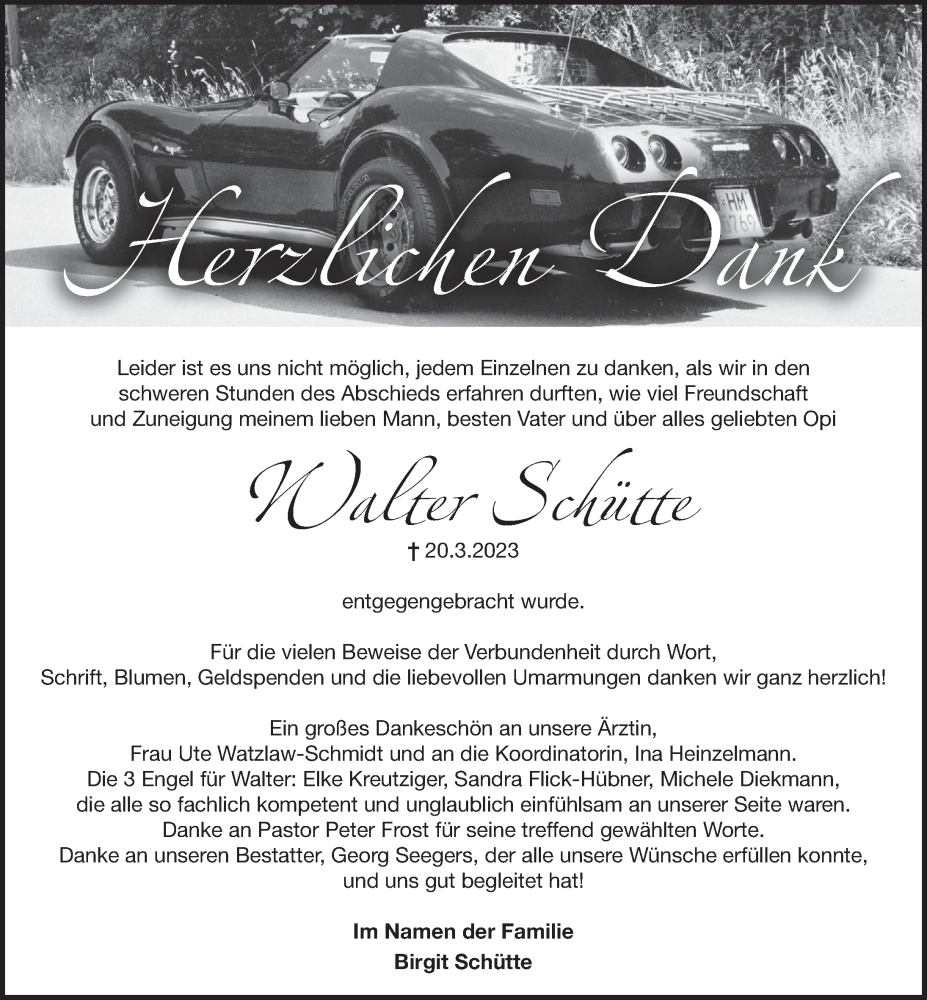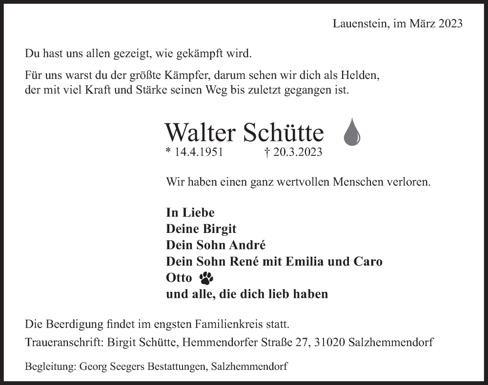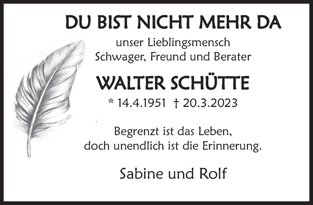 Hier finden Sie alle Traueranzeigen aus der Zeitung, die bisher für Walter Schütte erschienen sind. Weitere Traueranzeigen, die in der Zeitung erscheinen, werden hier ebenfalls aufgelistet