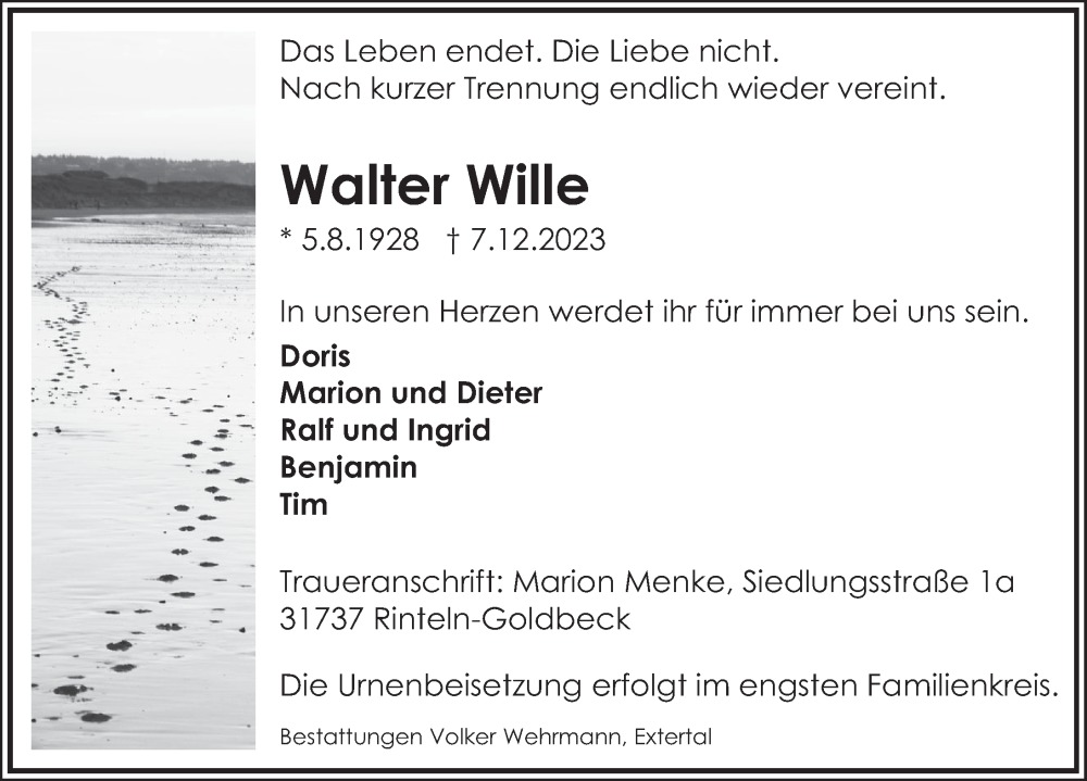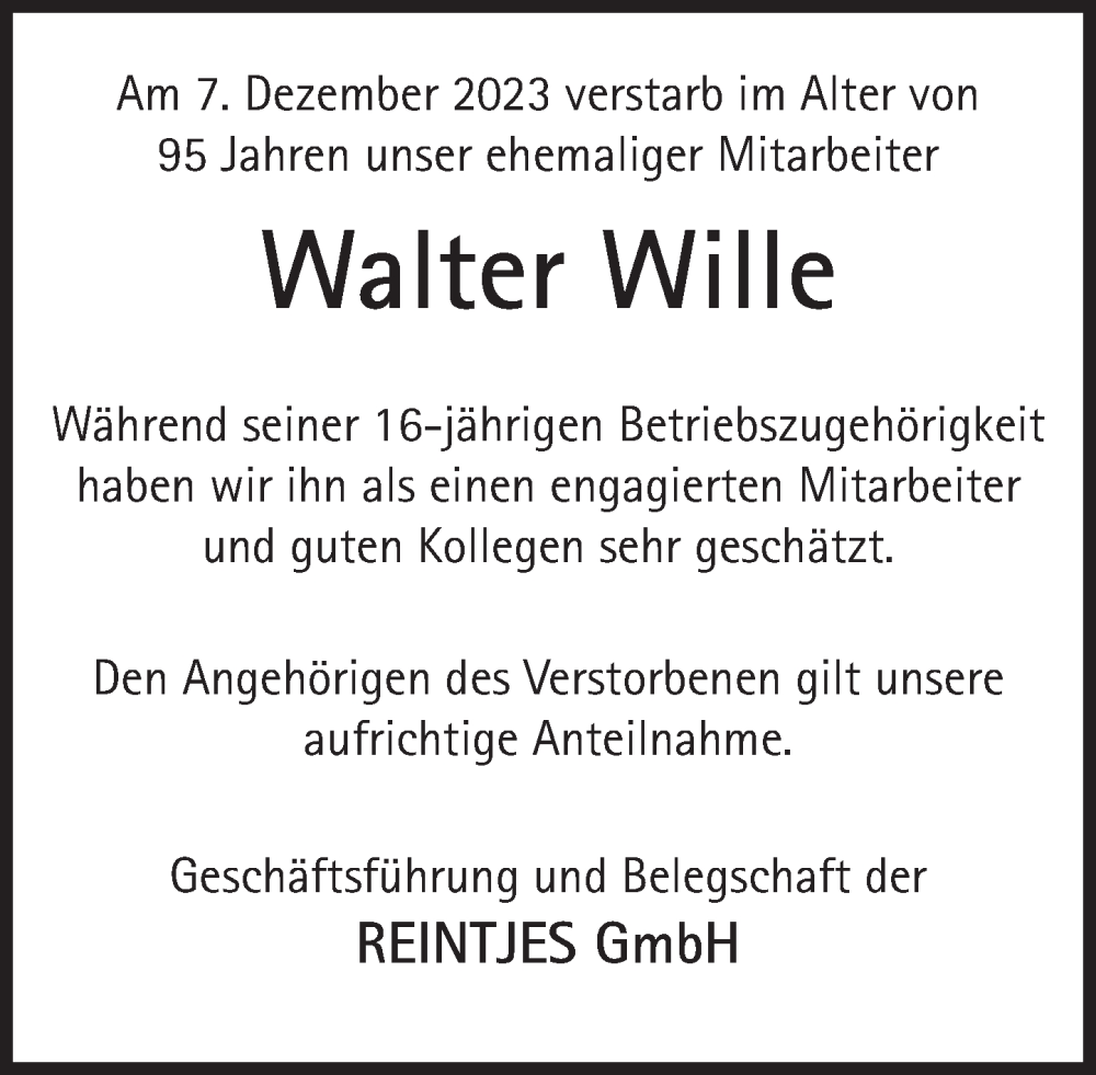 Hier finden Sie alle Traueranzeigen aus der Zeitung, die bisher für Walter Wille erschienen sind. Weitere Traueranzeigen, die in der Zeitung erscheinen, werden hier ebenfalls aufgelistet