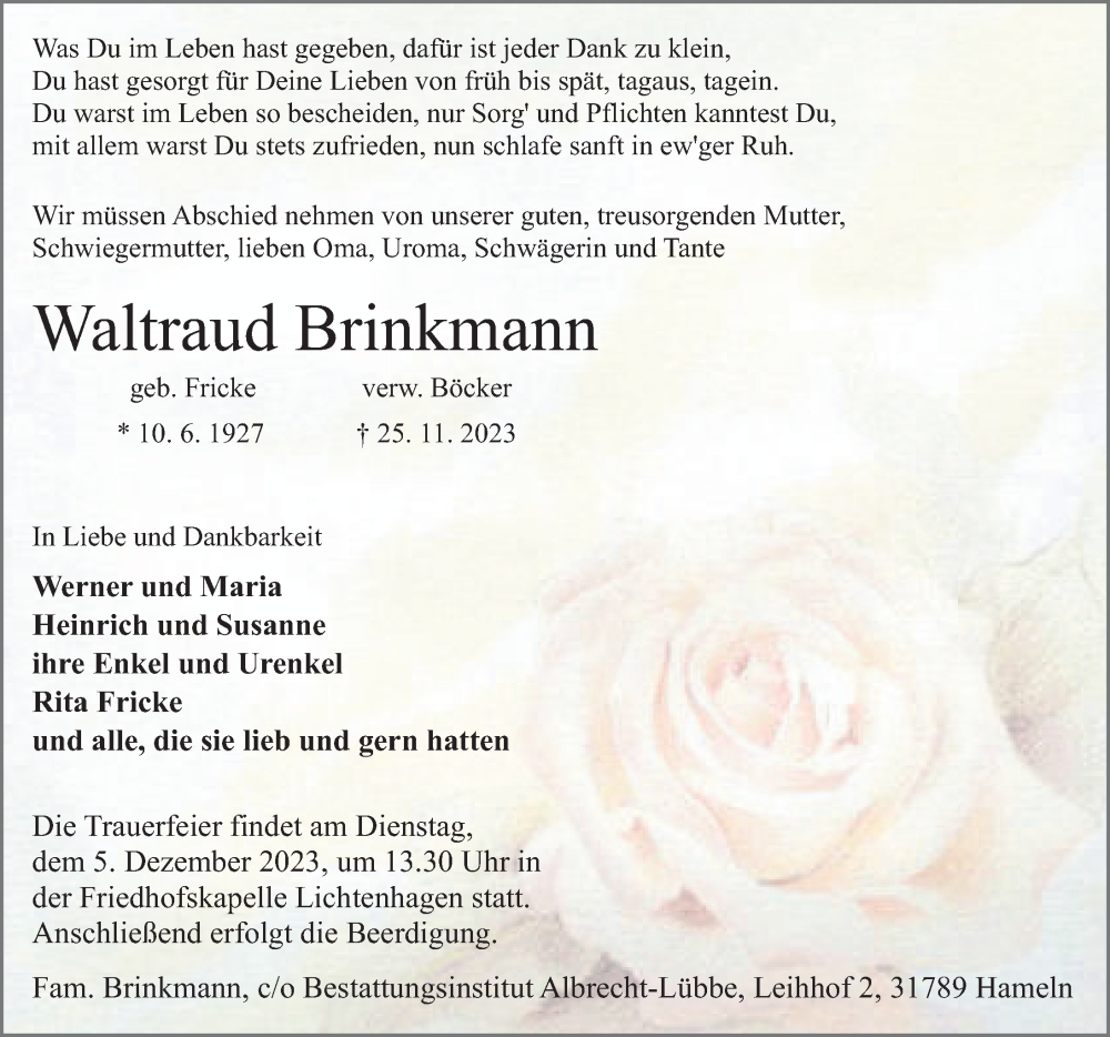 Hier finden Sie alle Traueranzeigen aus der Zeitung, die bisher für Waltraud Brinkmann erschienen sind. Weitere Traueranzeigen, die in der Zeitung erscheinen, werden hier ebenfalls aufgelistet