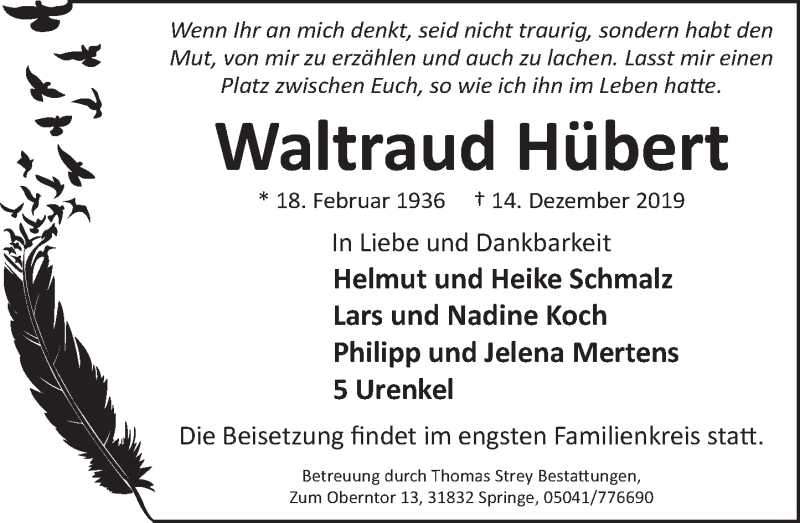 Hier finden Sie alle Traueranzeigen aus der Zeitung, die bisher für Waltraud Hübert erschienen sind. Weitere Traueranzeigen, die in der Zeitung erscheinen, werden hier ebenfalls aufgelistet