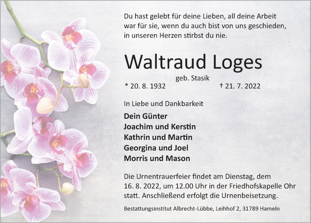 Hier finden Sie alle Traueranzeigen aus der Zeitung, die bisher für Waltraud Loges erschienen sind. Weitere Traueranzeigen, die in der Zeitung erscheinen, werden hier ebenfalls aufgelistet