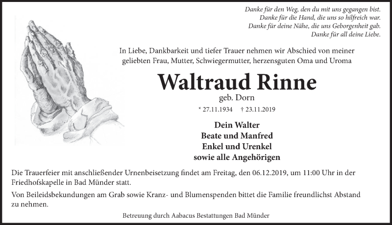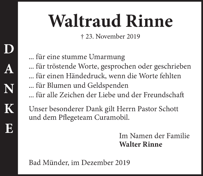Hier finden Sie alle Traueranzeigen aus der Zeitung, die bisher für Waltraud Rinne erschienen sind. Weitere Traueranzeigen, die in der Zeitung erscheinen, werden hier ebenfalls aufgelistet