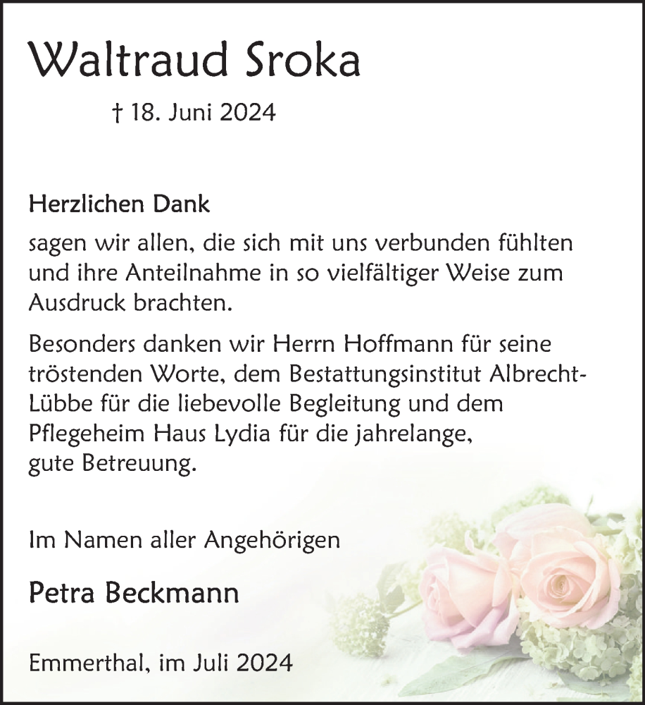 Hier finden Sie alle Traueranzeigen aus der Zeitung, die bisher für Waltraud Sroka erschienen sind. Weitere Traueranzeigen, die in der Zeitung erscheinen, werden hier ebenfalls aufgelistet
