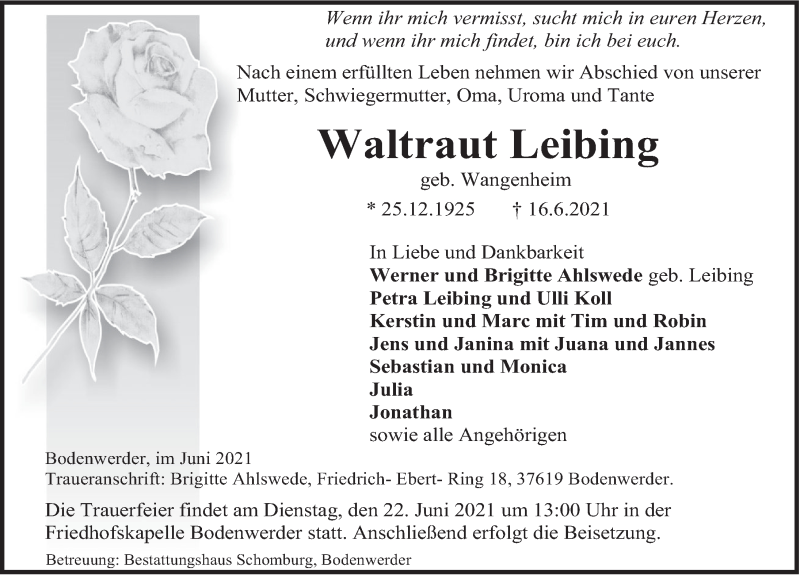 Hier finden Sie alle Traueranzeigen aus der Zeitung, die bisher für Waltraut Leibing erschienen sind. Weitere Traueranzeigen, die in der Zeitung erscheinen, werden hier ebenfalls aufgelistet