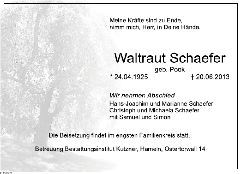 Hier finden Sie alle Traueranzeigen aus der Zeitung, die bisher für Waltraut Schaefer erschienen sind. Weitere Traueranzeigen, die in der Zeitung erscheinen, werden hier ebenfalls aufgelistet
