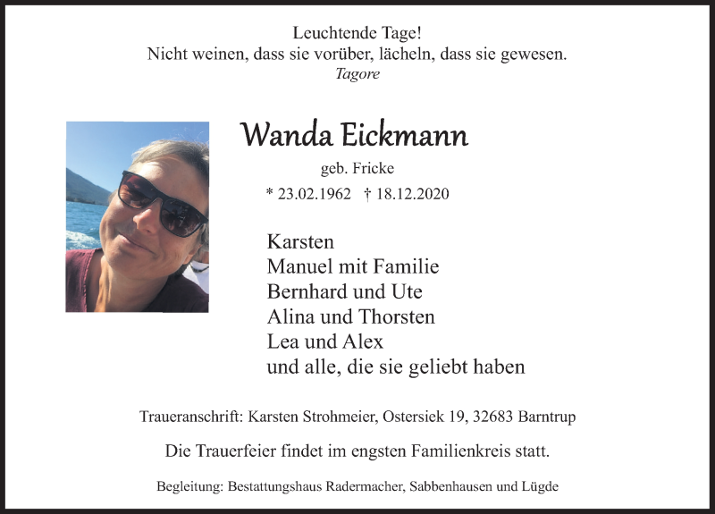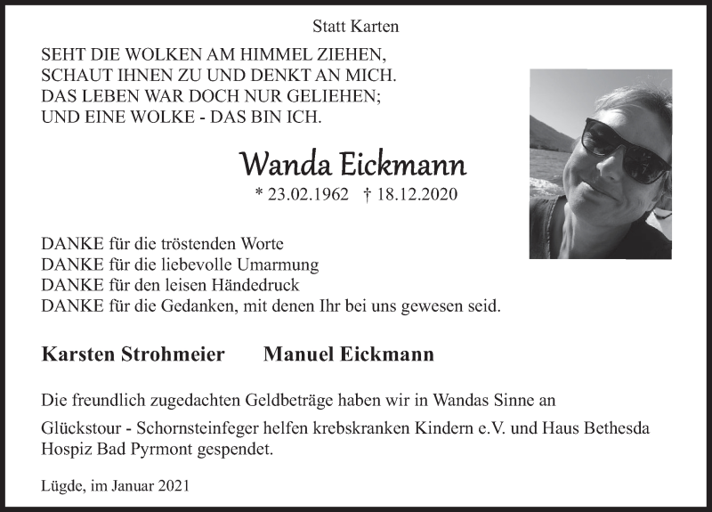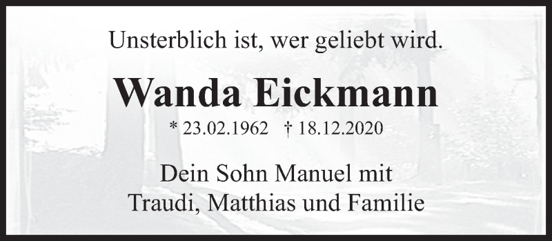 Hier finden Sie alle Traueranzeigen aus der Zeitung, die bisher für Wanda Eickmann erschienen sind. Weitere Traueranzeigen, die in der Zeitung erscheinen, werden hier ebenfalls aufgelistet