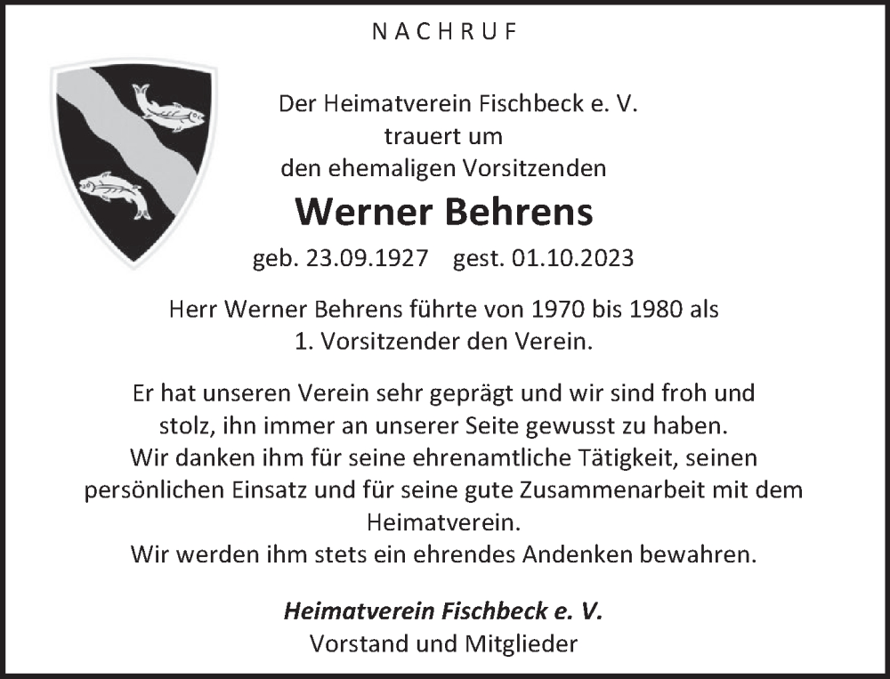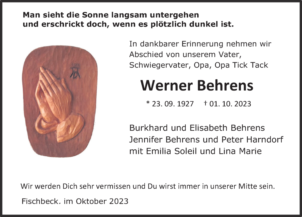 Hier finden Sie alle Traueranzeigen aus der Zeitung, die bisher für Werner Behrens erschienen sind. Weitere Traueranzeigen, die in der Zeitung erscheinen, werden hier ebenfalls aufgelistet
