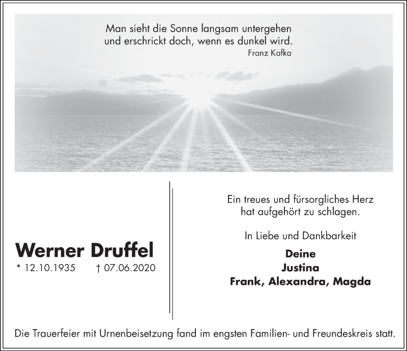 Hier finden Sie alle Traueranzeigen aus der Zeitung, die bisher für Werner Druffel erschienen sind. Weitere Traueranzeigen, die in der Zeitung erscheinen, werden hier ebenfalls aufgelistet