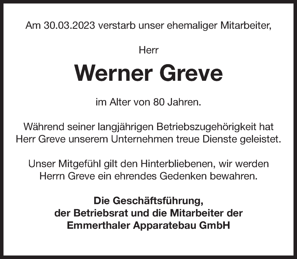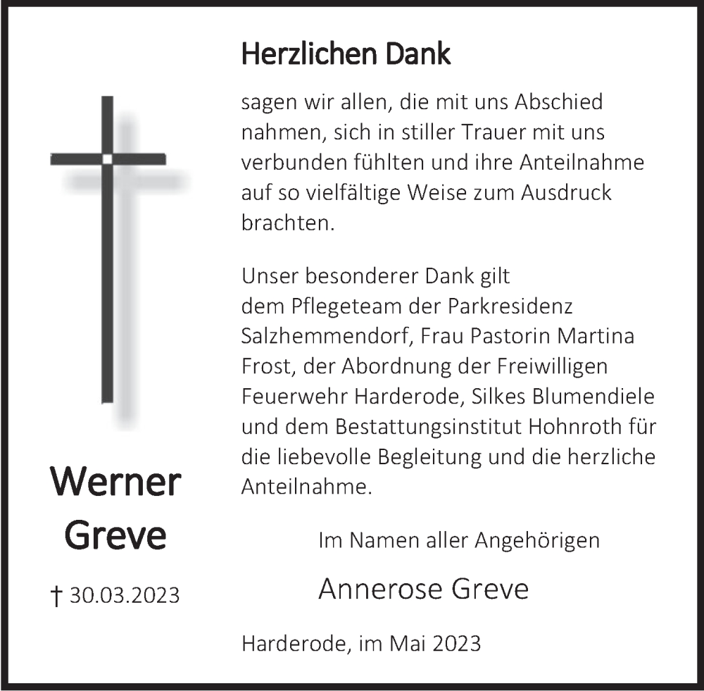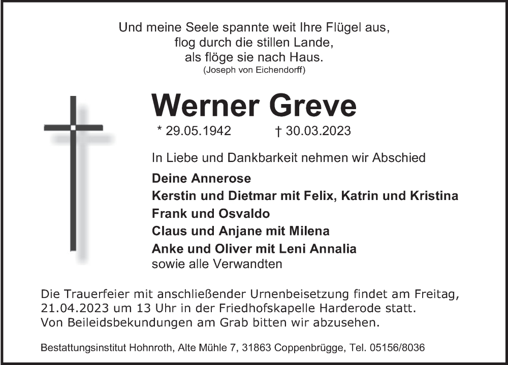Hier finden Sie alle Traueranzeigen aus der Zeitung, die bisher für Werner Greve erschienen sind. Weitere Traueranzeigen, die in der Zeitung erscheinen, werden hier ebenfalls aufgelistet
