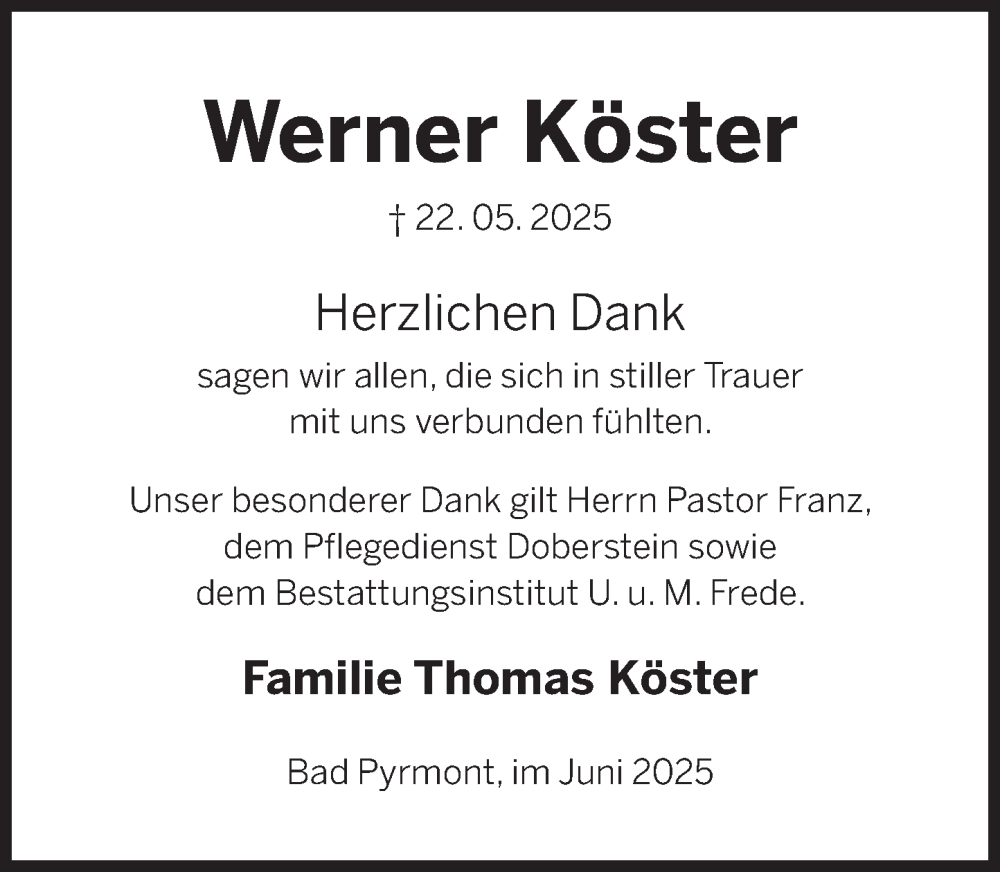 Hier finden Sie alle Traueranzeigen aus der Zeitung, die bisher für Werner Köster erschienen sind. Weitere Traueranzeigen, die in der Zeitung erscheinen, werden hier ebenfalls aufgelistet
