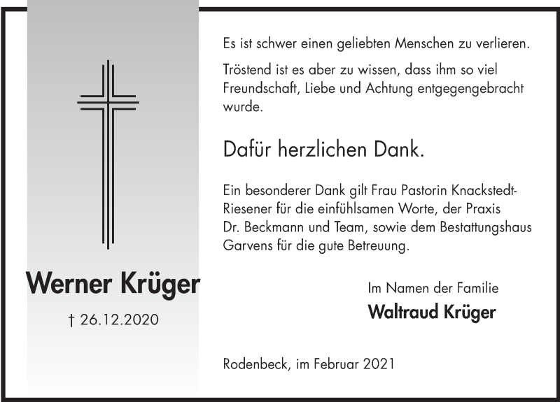 Hier finden Sie alle Traueranzeigen aus der Zeitung, die bisher für Werner Krüger erschienen sind. Weitere Traueranzeigen, die in der Zeitung erscheinen, werden hier ebenfalls aufgelistet