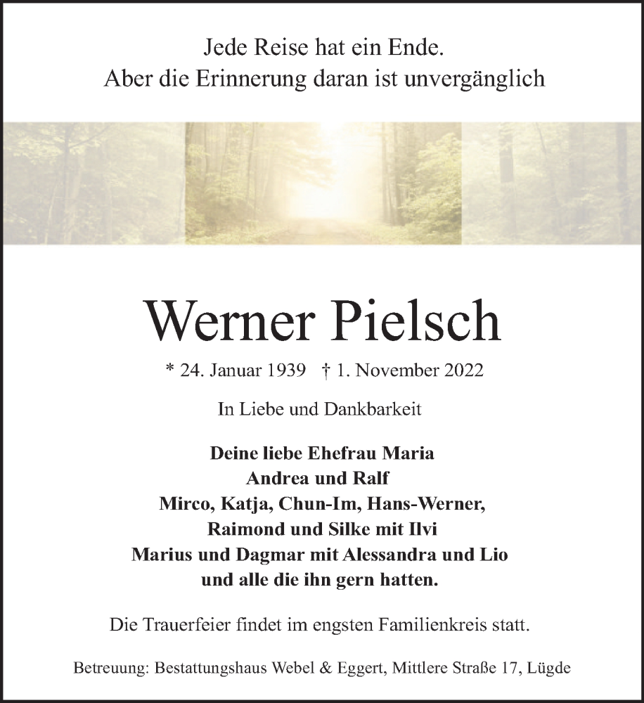 Hier finden Sie alle Traueranzeigen aus der Zeitung, die bisher für Werner Pielsch erschienen sind. Weitere Traueranzeigen, die in der Zeitung erscheinen, werden hier ebenfalls aufgelistet