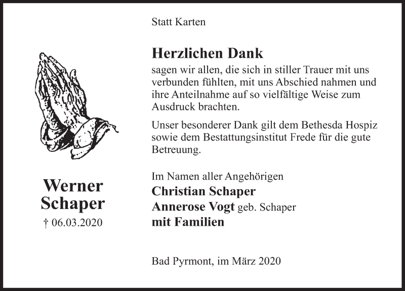 Hier finden Sie alle Traueranzeigen aus der Zeitung, die bisher für Werner Schaper erschienen sind. Weitere Traueranzeigen, die in der Zeitung erscheinen, werden hier ebenfalls aufgelistet
