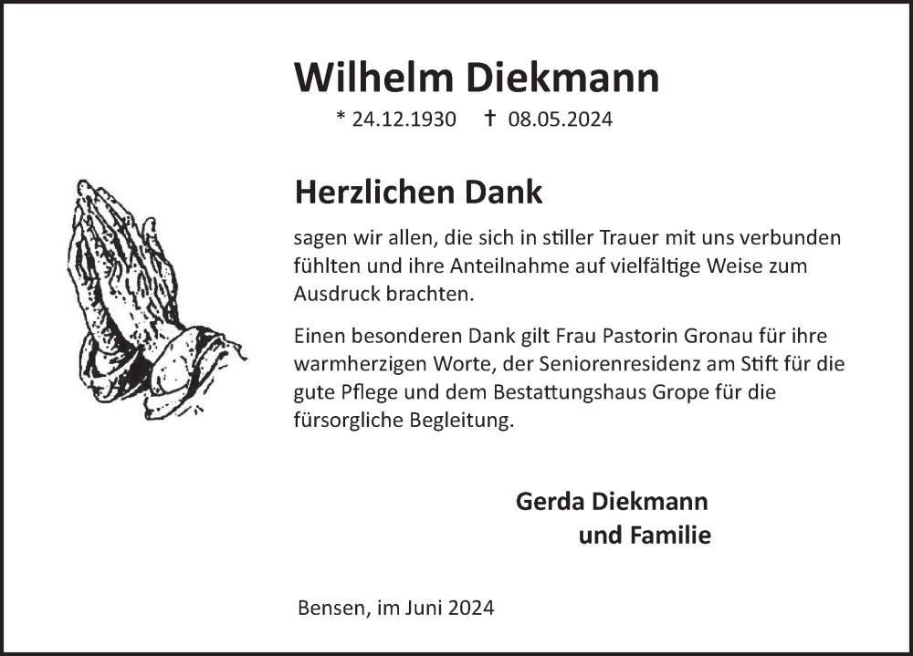 Hier finden Sie alle Traueranzeigen aus der Zeitung, die bisher für Wilhelm Diekmann erschienen sind. Weitere Traueranzeigen, die in der Zeitung erscheinen, werden hier ebenfalls aufgelistet