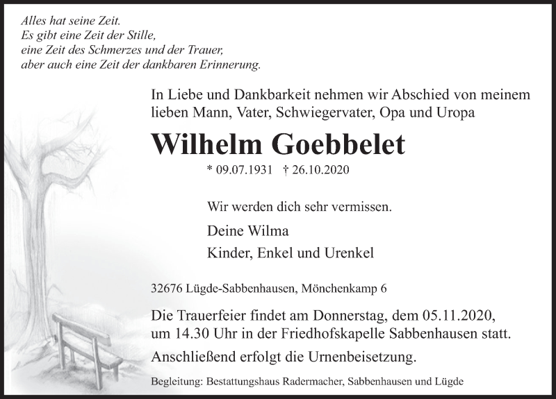 Hier finden Sie alle Traueranzeigen aus der Zeitung, die bisher für Wilhelm Goebbelet erschienen sind. Weitere Traueranzeigen, die in der Zeitung erscheinen, werden hier ebenfalls aufgelistet