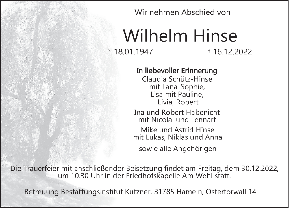 Hier finden Sie alle Traueranzeigen aus der Zeitung, die bisher für Wilhelm Hinse erschienen sind. Weitere Traueranzeigen, die in der Zeitung erscheinen, werden hier ebenfalls aufgelistet